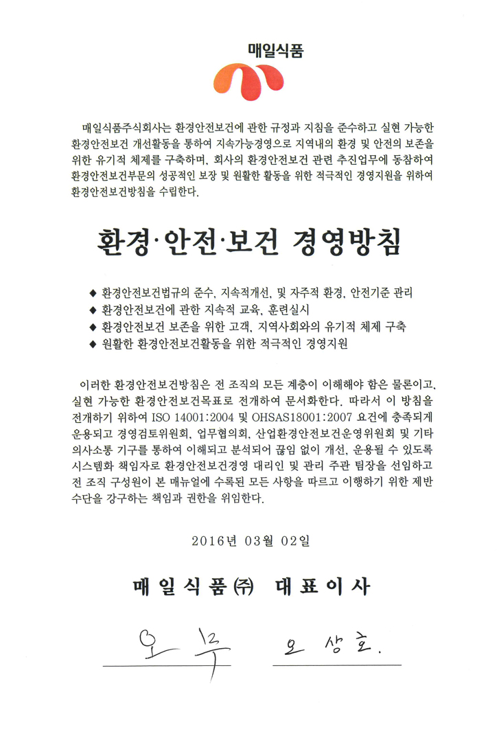 매일식품(주) - 환경·안전·보건 경영방침 ()